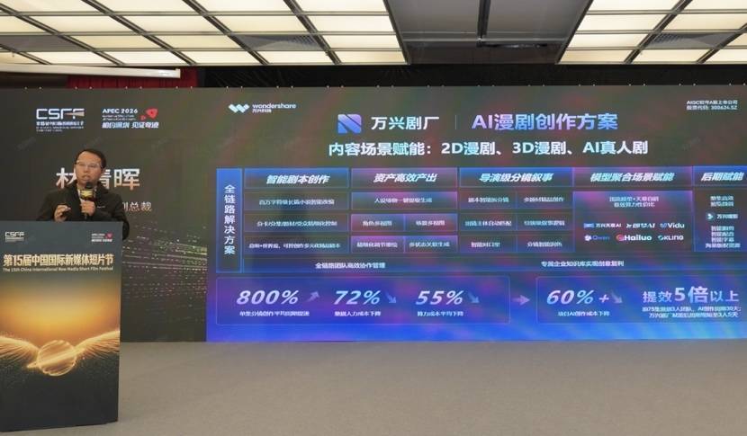 (万兴剧厂正式开放,打造AI驱动的一站式精品漫剧创作平台)当天,万兴科技副总裁林倩晖受邀出席大会AI赋能微短剧专场,并发表题为《破局漫界 剧变将至——AI重构工业化漫剧生产新范式》的主题演讲。